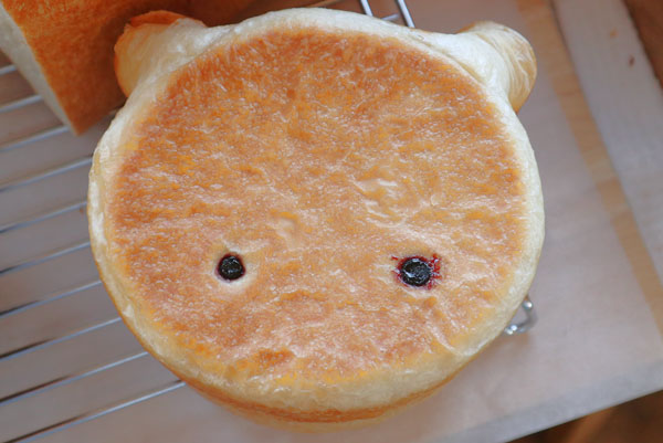 コーヒー生地のくまのかたちのパンに無添加ハム、ゴーダチーズ、目玉焼き、レタス | ||